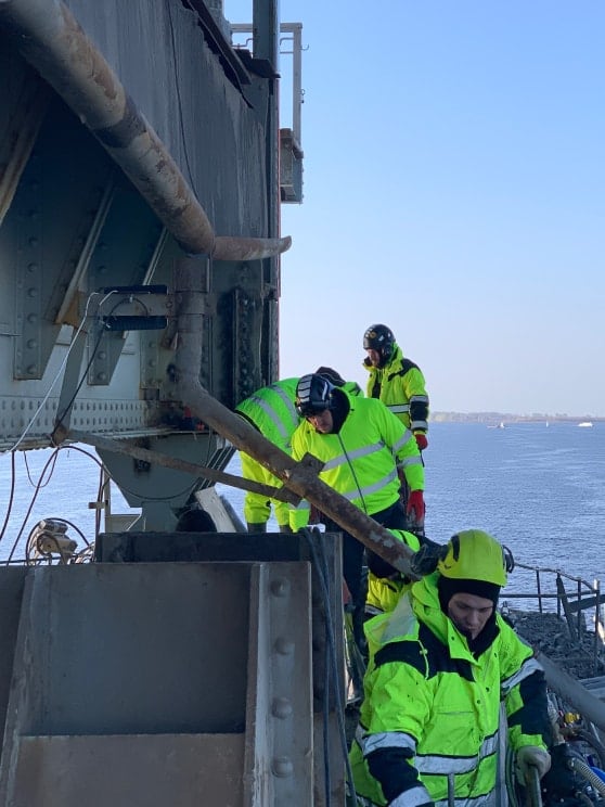 Как только на мосту останавливали движение и поднимали подъемную секцию, мы приступали к разгрузке оборудования на опору и подключению коммуникаций. На одной опоре могло находиться 12 установок алмазного бурения HILTI DD350 и каждая требовала бесперебойной работы – ничего не должно подвести, поэтому многие решения дублировались.