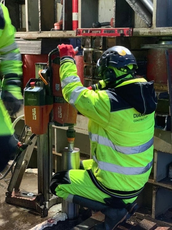 В условиях где на площади 4м² параллельно работает 6 установок алмазного сверления, выбиваются керны, убирается пылесосом шлам, параллельно идет монтаж металлоконструкций и вклейка анкеров, а на работу отведено всего 2 часа и те в ночное время, принцип «минимум персонала – максимум технологий» играет ключевую роль в успехе проекта. На объекте должны быть только специалисты!