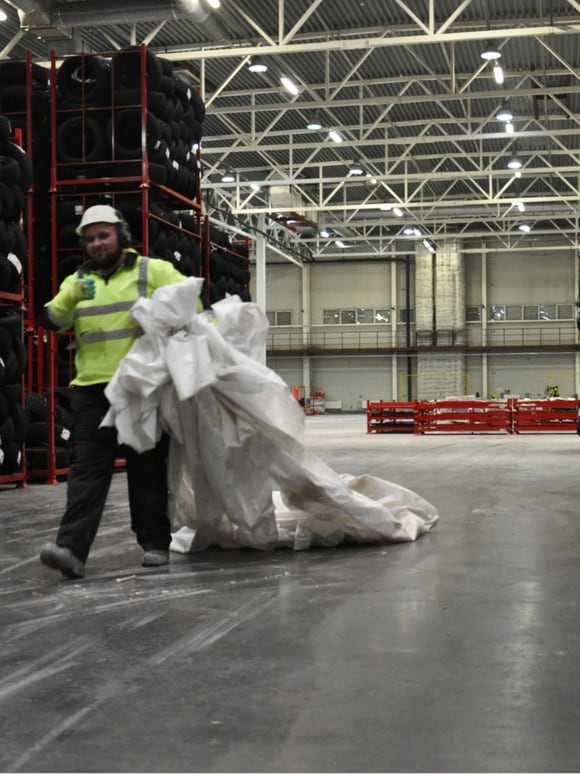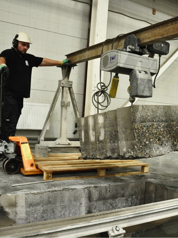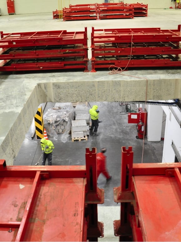 Вырезанные фрагменты демонтируем при помощи мобильного крана с профессиональной электроталью. И отвозим их на гидравлической тележке к месту временного складирования.